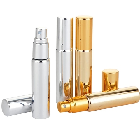 โรงงาน ODM OEM ผลิตขวดน้ำหอมตัวอย่างแก้วทรงกลมขนาดเล็ก 10 มล. คอขวดขนาด 13 มม. สีทองเงาและสีเงิน พร้อมหัวฉีด รับผลิตตามสีที่ต้องการ