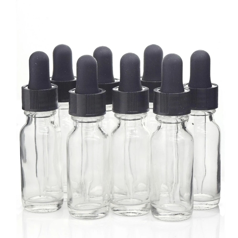 โรงงาน ODM ขายส่งขวดแก้วใสขนาด 15 มล. 0.5 ออนซ์ สำหรับน้ำมันหอมระเหย พร้อมหลอดหยดพลาสติกสีดำ